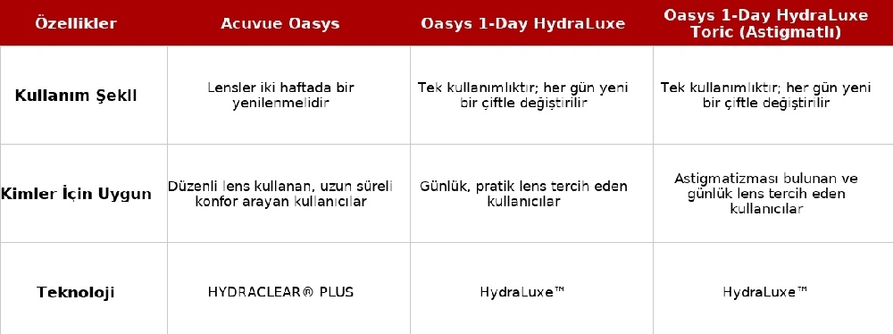 Göz kuruluğu yaşayan, uzun süre bilgisayar başında çalışan veya kontakt lens takarken rahatlık arayan kullanıcılar için Acuvue Oasys serisi, en popüler lenslerden biridir.